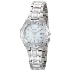 Three-hand Japanese Quartz movement displaying polished silver-tone hour and minute hands with Lumibrite accents and polished sweep seconds, Applied and polished baton hour markers accentuated by Lumibrite indicators, Black indices mark outer minute track, Analog date display at 3, Polished silver-tone bezel encrusted with sixteen diamonds, Brushed and polished silver-tone stainless steel hexagon-shaped case with notched/polished crown, Stainless steel caseback, Hardlex Crystal, 100 meters/330 feet water resistant
