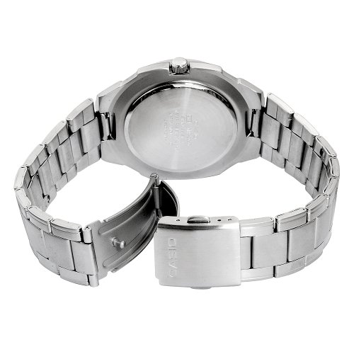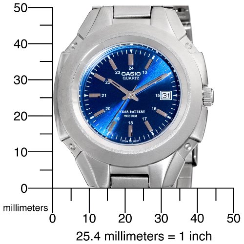 This Classic Series Casio dress watch features a sleek and elegant look perfect for the office, after-hours, and everyday use. The streamlined design smoothly merges the stainless steel band with the round stainless steel bezel, and the silver-toned hour markers and hands on the metallic-blue dial complete the look. The date conveniently displays at three o'clock, and the subtle inner ring of Arabic numeral indexes makes 24-hour conversion easy. The band closes with a fold-over clasp, with a secure double push-button safety release. This quartz movement watch comes with a 10-year battery life, offers water resistance up to 165 feet........