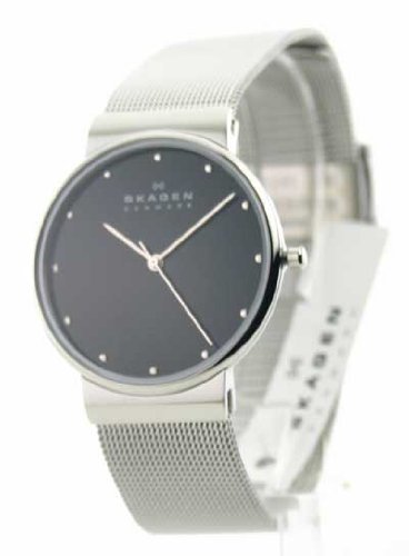 "* All Stainless Steel Case and Band * Dressy Silver Mesh Stainless Steel Adjustable Band * Analog with Silver Hands & Dots * Classic Round Striking Black Face * Silver Second Hand * Ultra Slim Watch Case * Hypo-Allergenic Nickel Safe * Precision Slim Japan Quartz Movement * Quality Parts * 3 ATM - 30 m - 100 ft - Water Resistant * Domed Super Hardened Scratch Resistant Mineral Crystal * Guaranteed 100% Authentic Skagen Watch * See Matching Women's Watch 355SSSB ****Watch Stats**** [FACE] * Style: Analog * Shape: Round * Size: 1-3/8 * Color: Black * Hands: Silver * Hour Markers: Silver Dots * Misc: Hypo-Allergenic Nickel Safe Second Hand [BAND] * Material: Stainless Steel * WristSize: up to 7-1/2"" * Width: 3/4"" * Color: Silver * Clasp: Double FoldOver * Misc: """