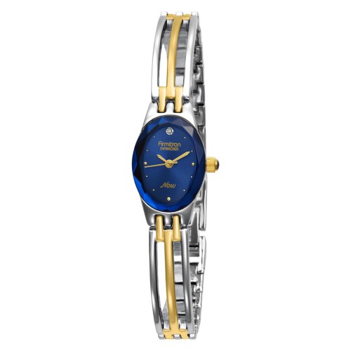 A blue oval dial is framed by a striking blue faceted bezel in this elegant two-tone bracelet watch from Armitron's Now collection. The watch offers three-hand function with goldtone hands, petite dot markers, and a genuine diamond accent hour marker at the twelve o'clock position. A goldtone cabochon crown adds an extra element of luxury, and a stylish two-tone open link bracelet completes the look.
