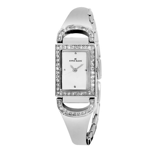 Dress watch, Quartz movement, Polished silver-tone hands and sweep seconds, Applied polished silver-tone dot markers at quarter hours, Polished silver-tone adjustable metal bangle with crystal detailing and jewelry-clasp, Polished silver-tone metal rectangular case with crystal detailing, Textured metal crown, Stainless steel caseback
