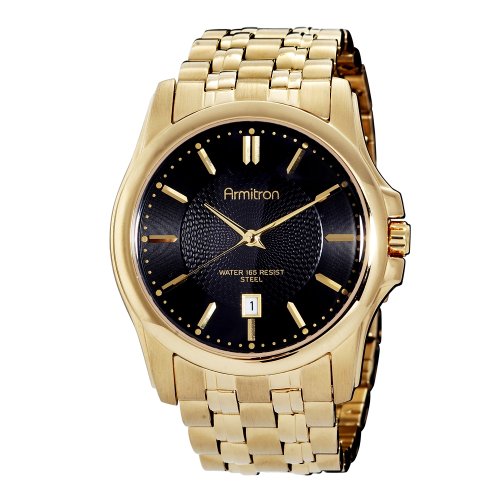 With a brushed and polished gold-toned stainless steel case and band, the Armitron Men's Dress Watch is ready to complement a variety of business and formal wear. Adding to this watch's overall formal, yet contemporary design is a round black dial that features gold-toned baton hour markers and hands. There is also a gold-toned crown on the right-hand side of the dial and a date window at the 6 o'clock position. Other features include water resistance to 165 feet (50 meters) and a band that closes with a fold-over double-push button safety clasp.