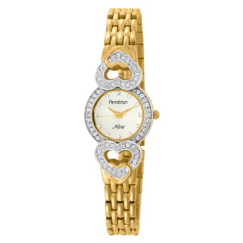 The Armitron Women's Now Collection Crystal Accented Heart watch is flirty and feminine. The timepiece is constructed with a 21-millimeter stainless steel case, and a round, glittering crystal bezel with crystal-adorned heart accents. The 13-millimeter gold-tone stainless steel link bracelet secures the analog-quartz-powered watch to your wrist with a bangle bracelet clasp. A protective mineral window shields the gold dial face, which features crystal hour markers, as well as gold-tone hour, minute, and second hands for sophisticated, stylish timekeeping.